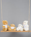 A cute mid brown coloured bear dressed in a removable white cotton T-shirt.  Remove all hang tags and their fasteners before giving these items to a child.